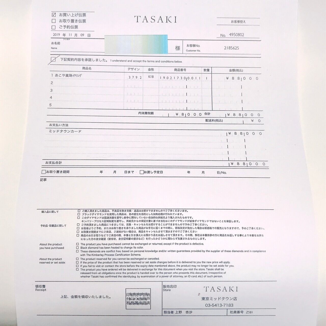 【付属品】箱、クロス、リボン、領収書(コピー)、保証書(2019年11月9日東京ミッドタウン購入)