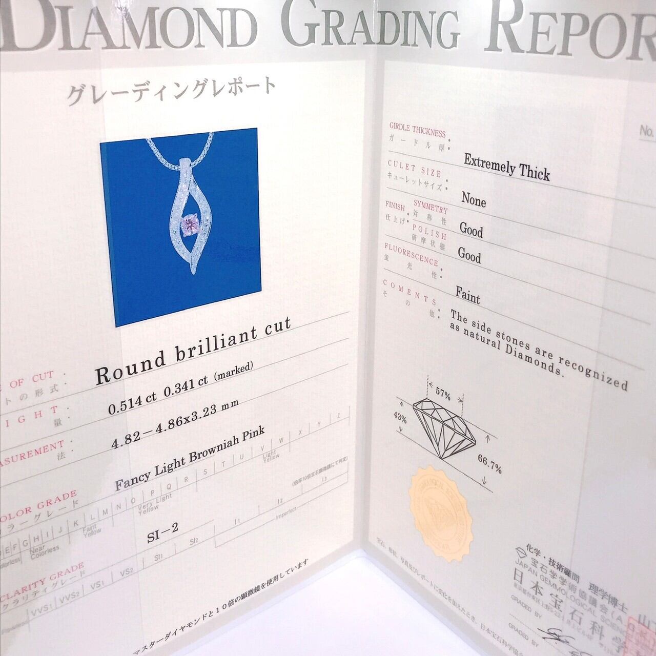 人為的処理(トリート)のされていない0.514ctの大粒天然ピンクダイヤモンドをセンターにセッティングした豪華なネックレスです。ピンクダイヤモンドとしてはかなり大きな部類の価値ある極めて希少なサイズです。カラーグレードはファンシーライトブラウニッシュピンクとなっており、ブラウニッシュが付いていますがメインカラーはピンク評価となります。クラリティは内包物などが肉眼ではほぼ見受けられない透明感あるSI2です。無色透明系のメレダイヤとのコントラストが美しく上品なデザインのお品物となっております。